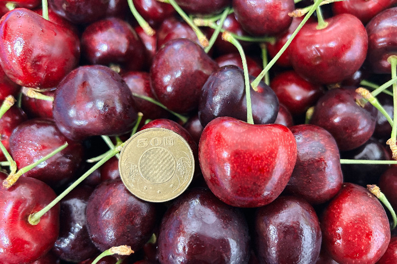 櫻桃的尺寸標準分為【ROW】和【MM】兩種分類,以 ROW 為標準的地區有美國和加拿大,【ROW】前面的數字越小,代表櫻桃的果實就越大顆,8.5R以上的櫻桃可是比50圓硬幣還大顆呢!